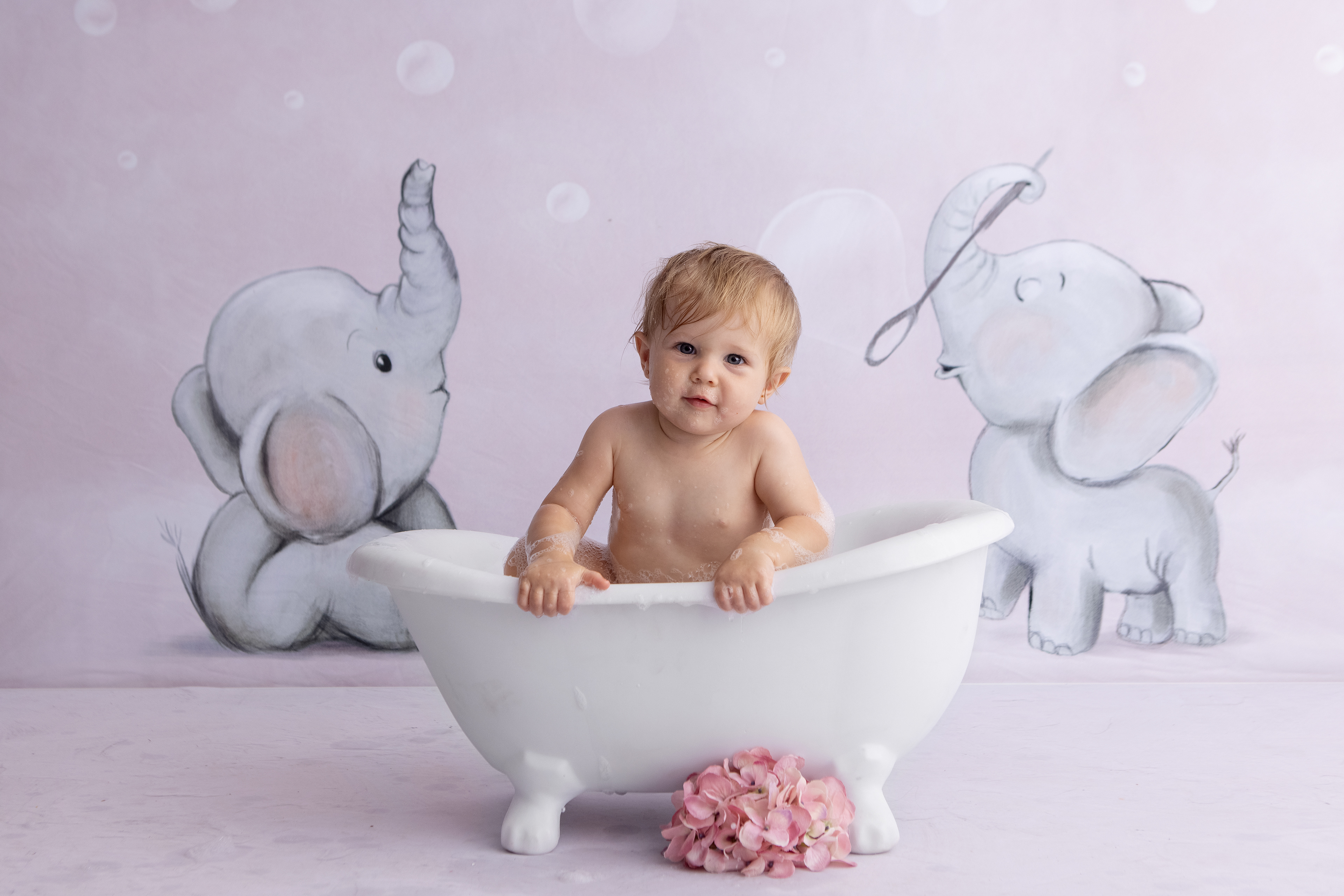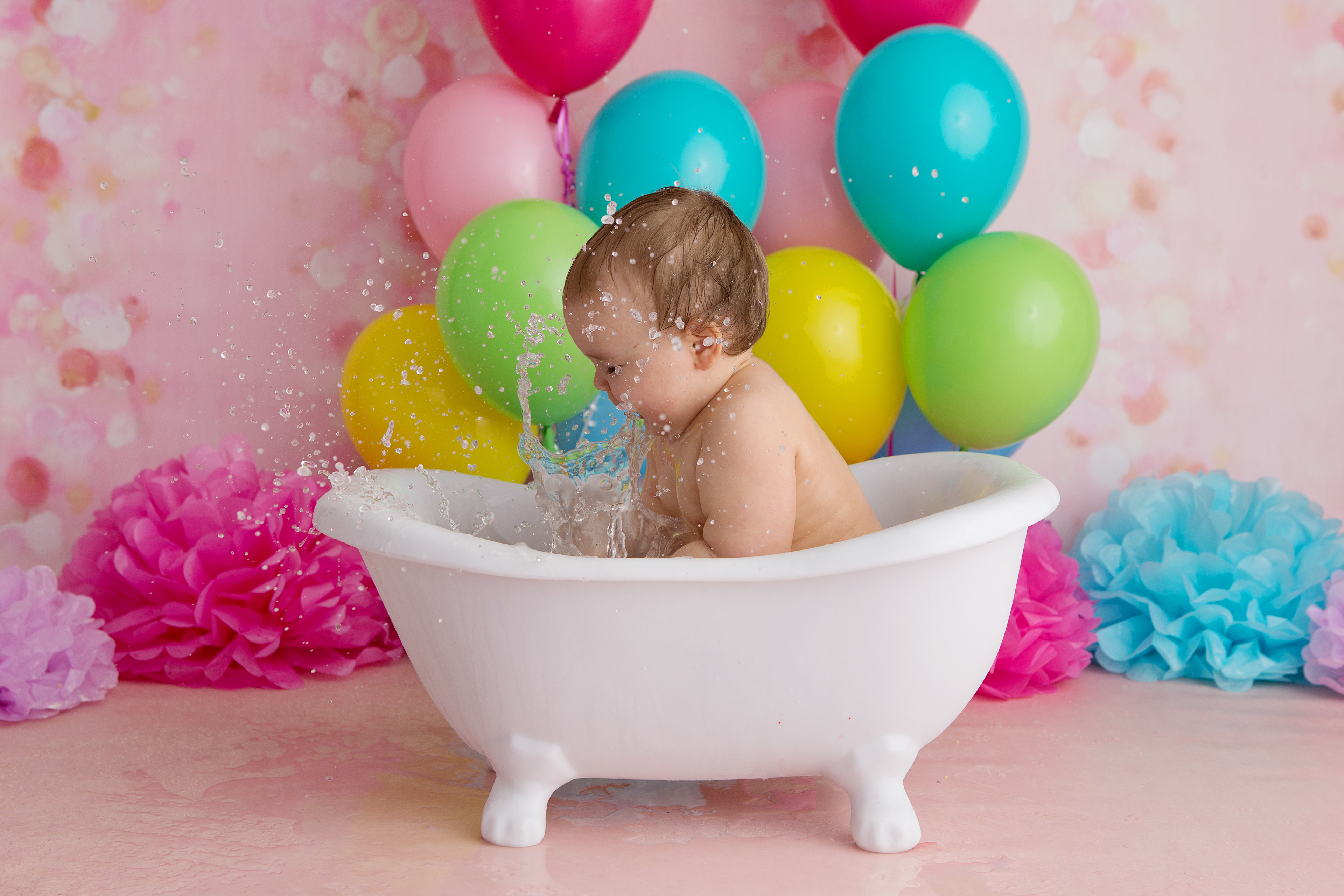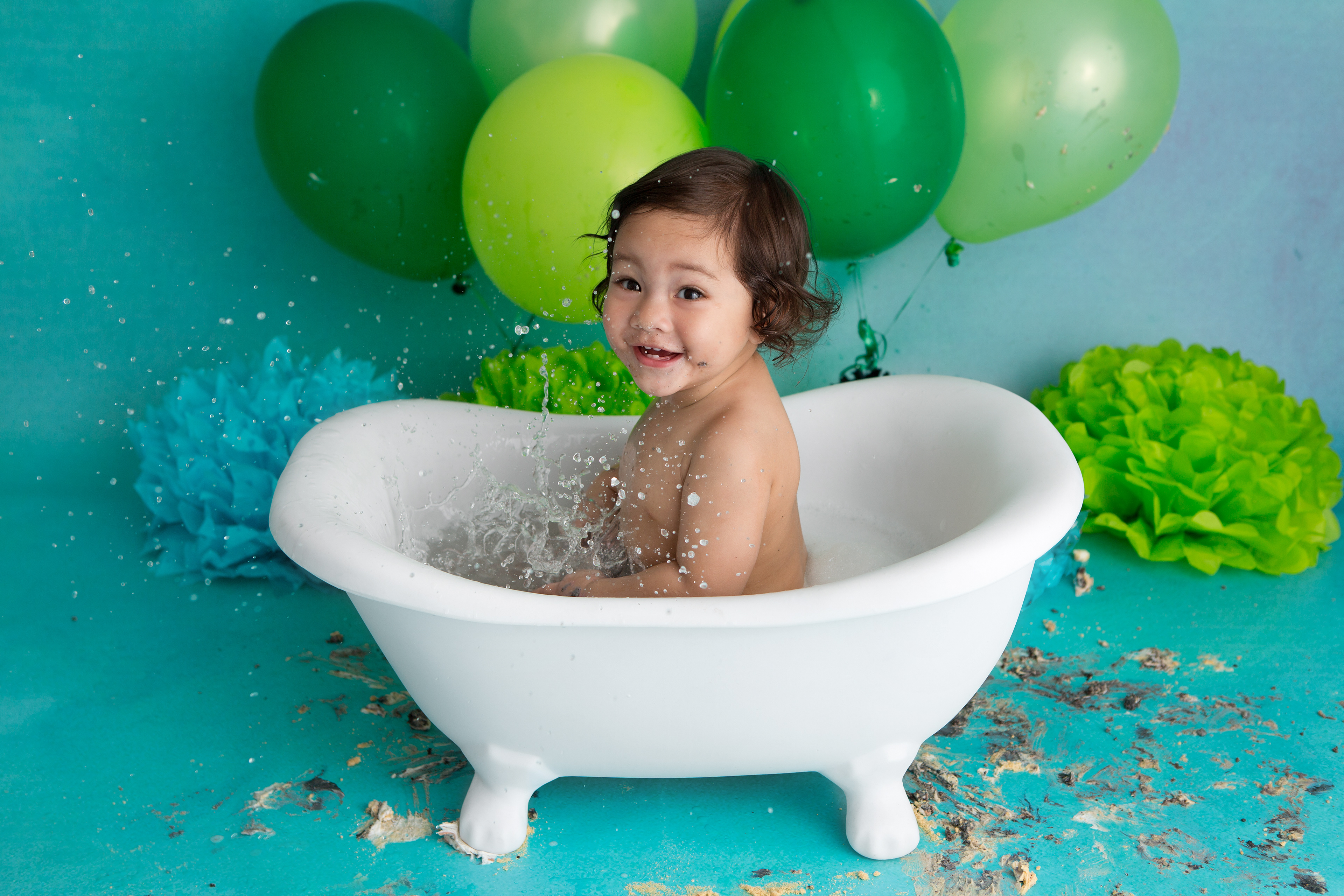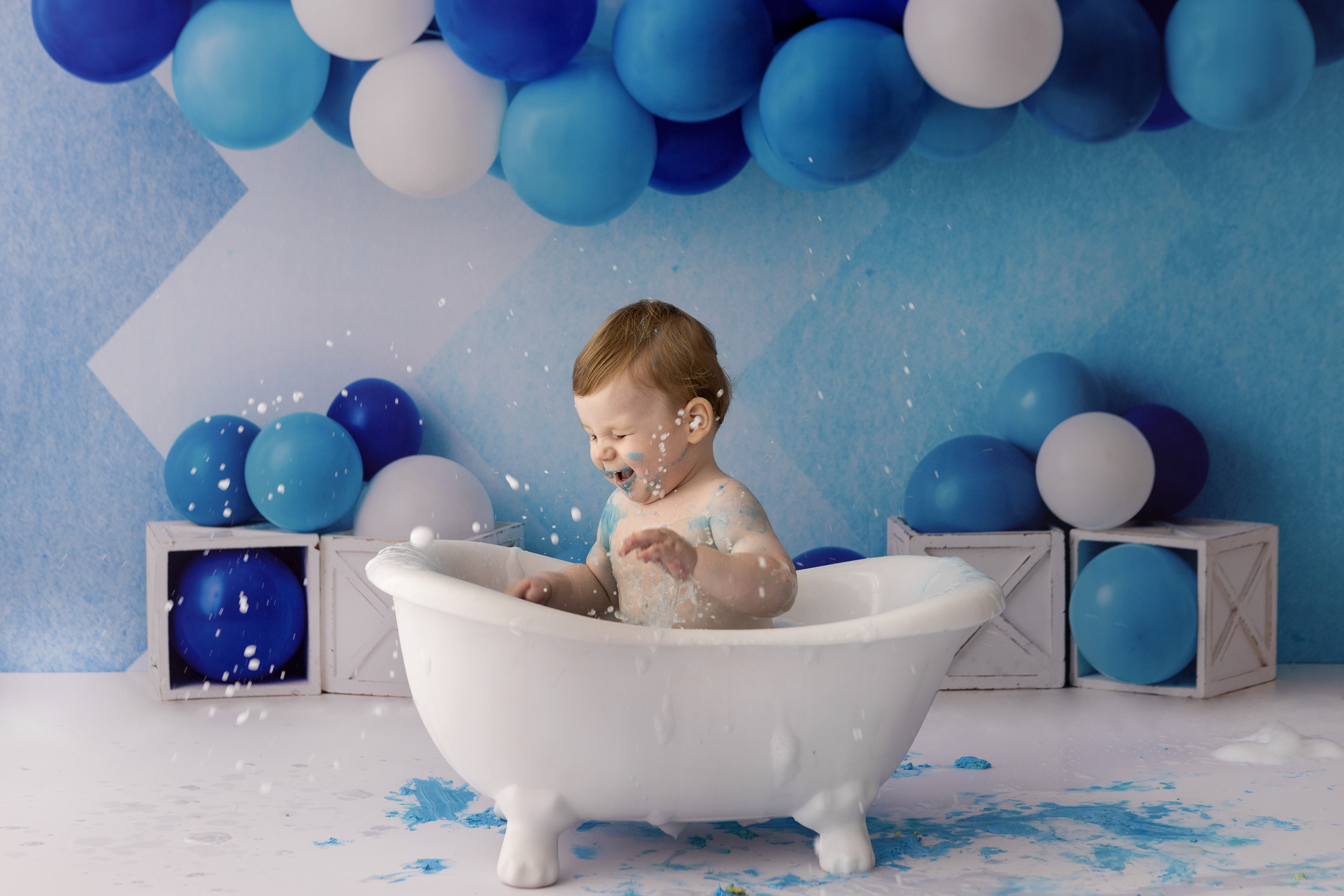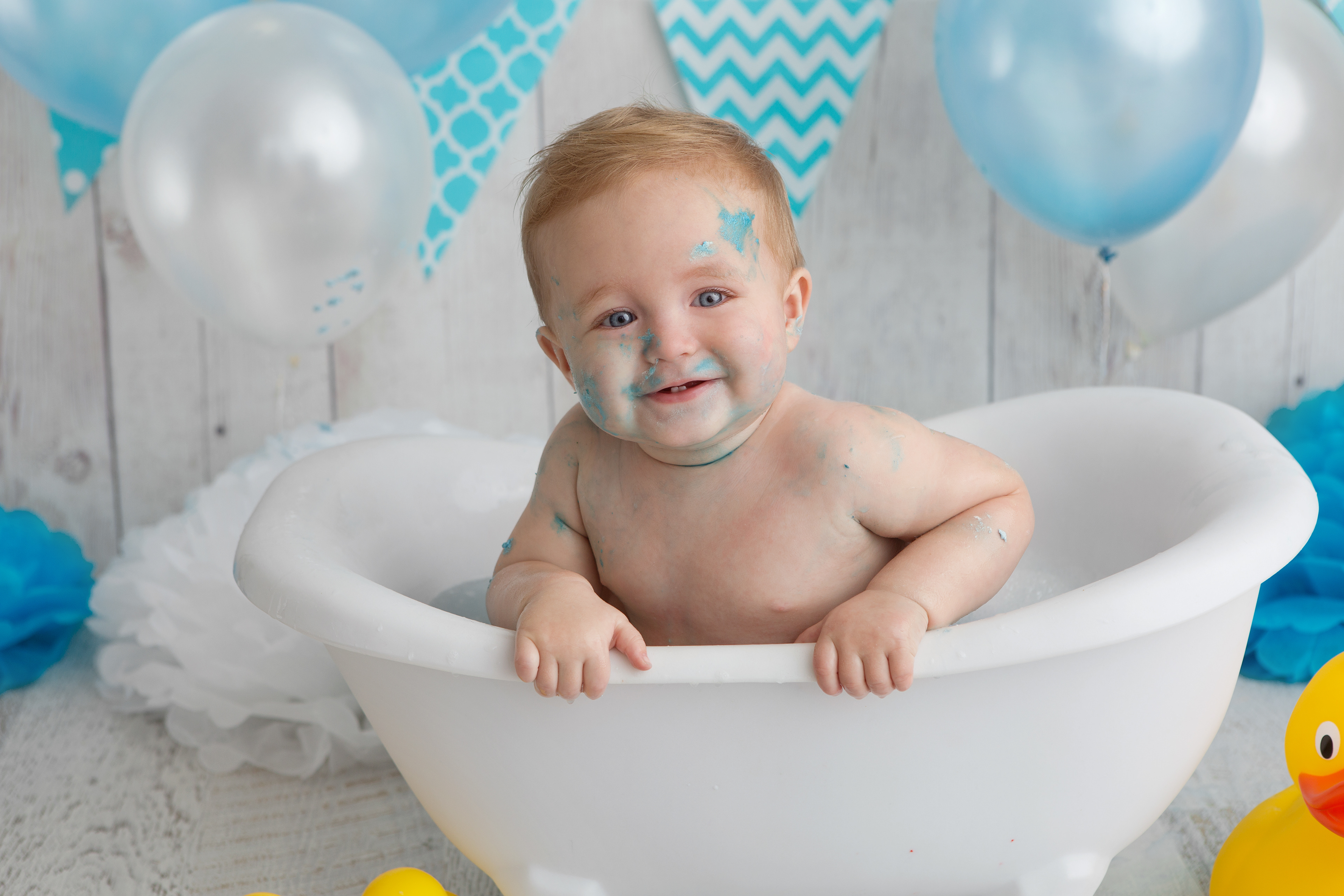 So much changes in that first year! Sitter age (6-9 months) is a perfect time for smiles and joy. 1 year Birthday milestone sessions are adorable, just more hectic as they are now crawling or walking! That is why the cake and bath are awesome distractions and so much fun. Family/sibling poses included!