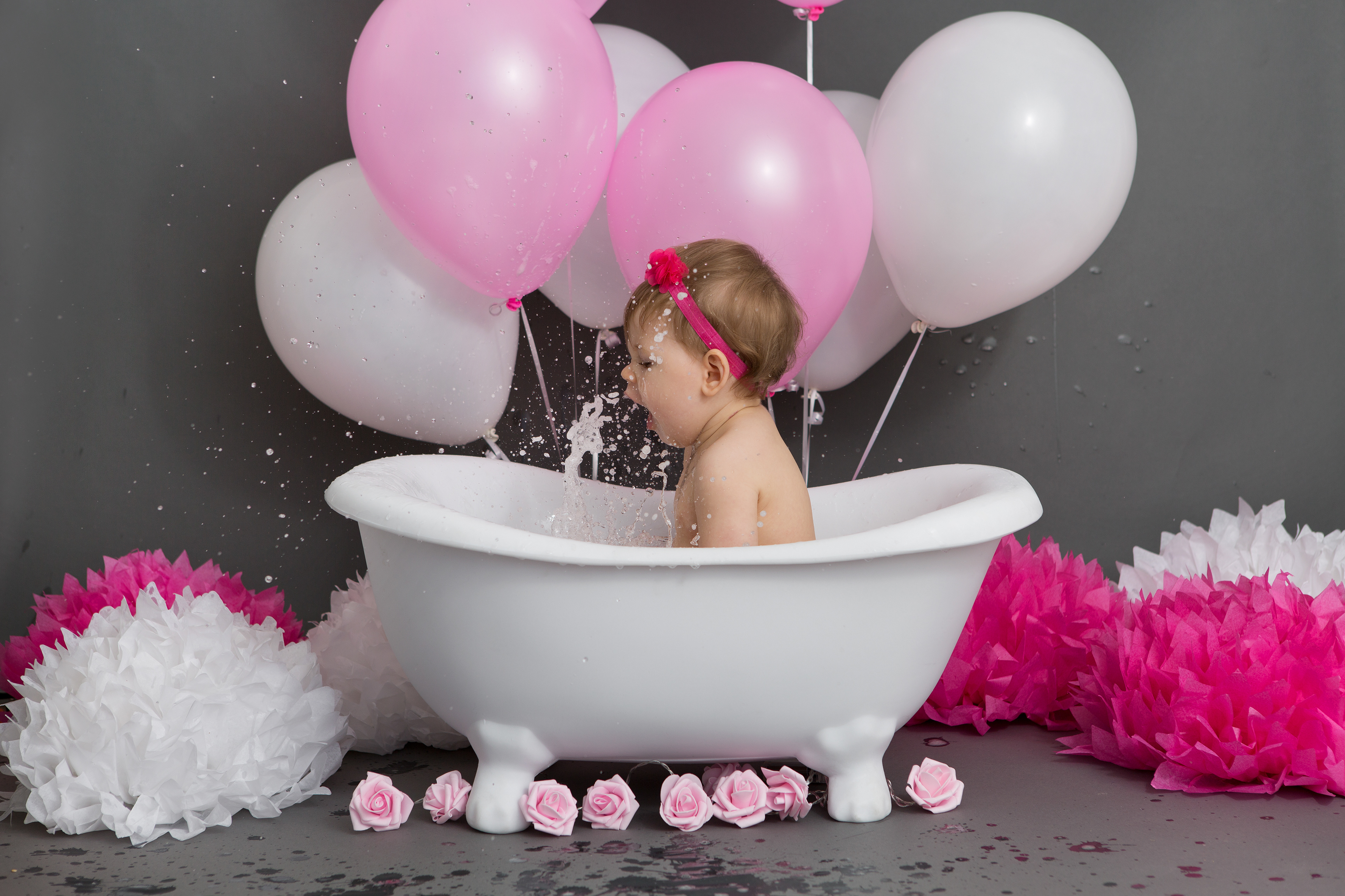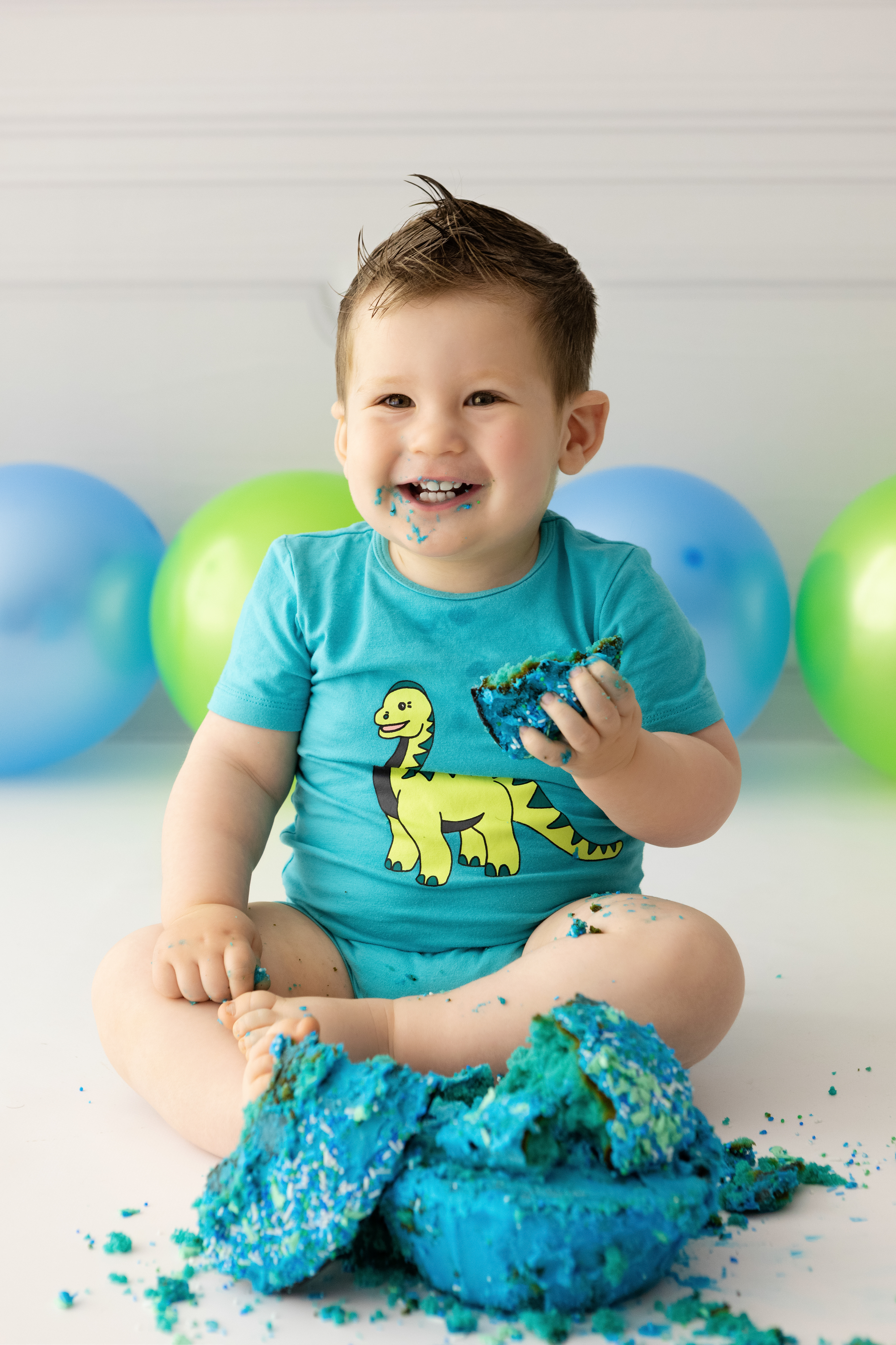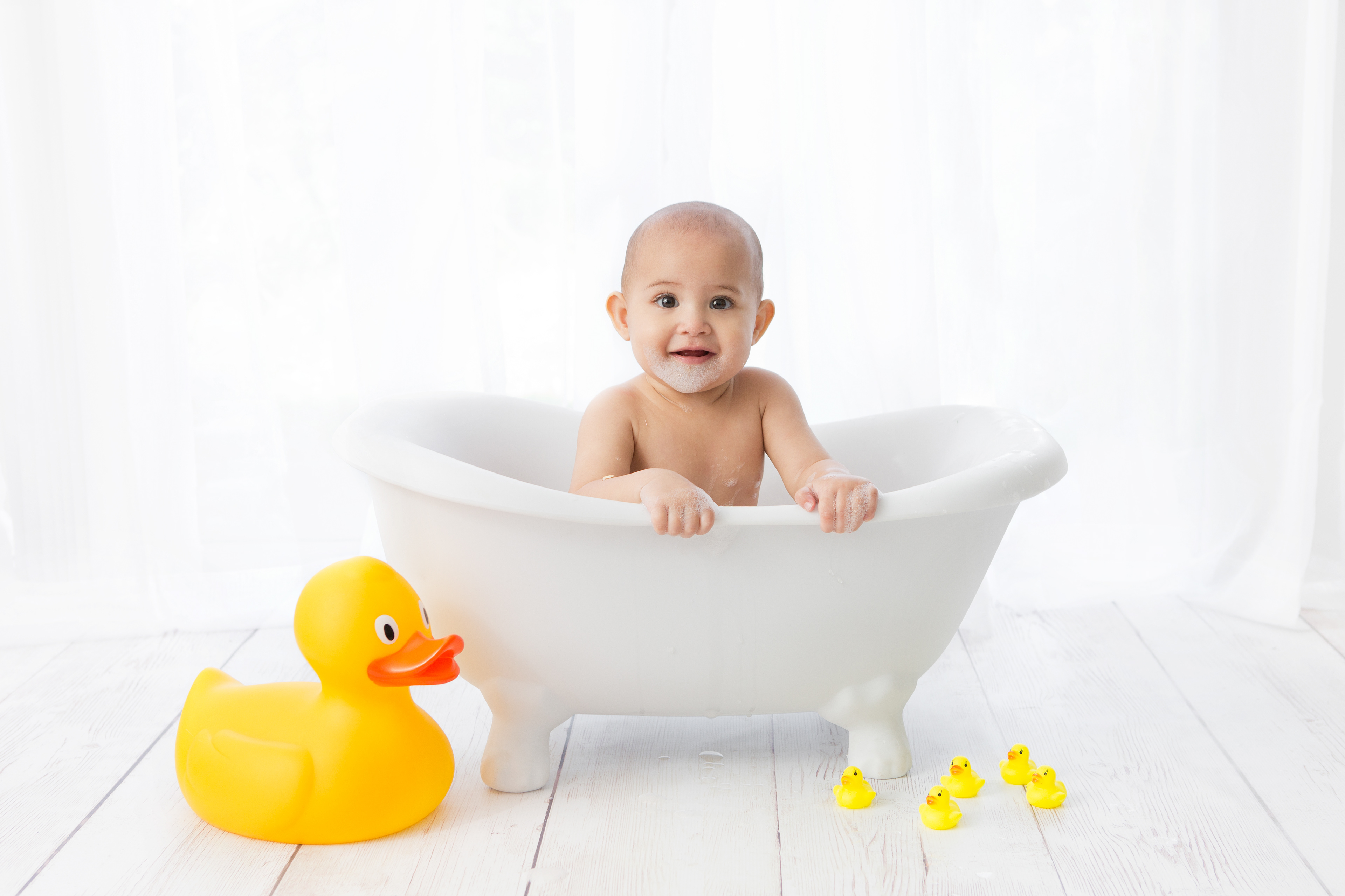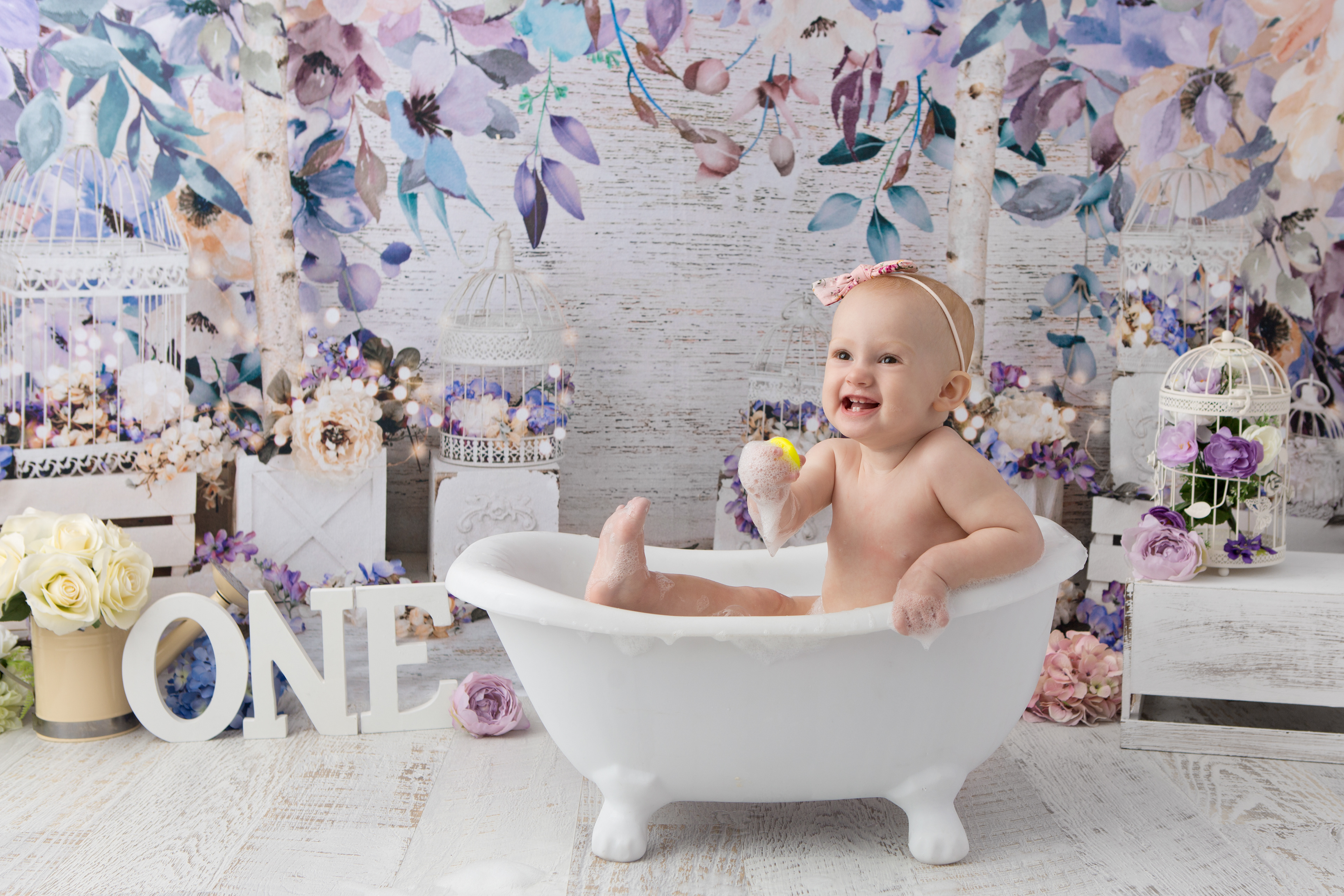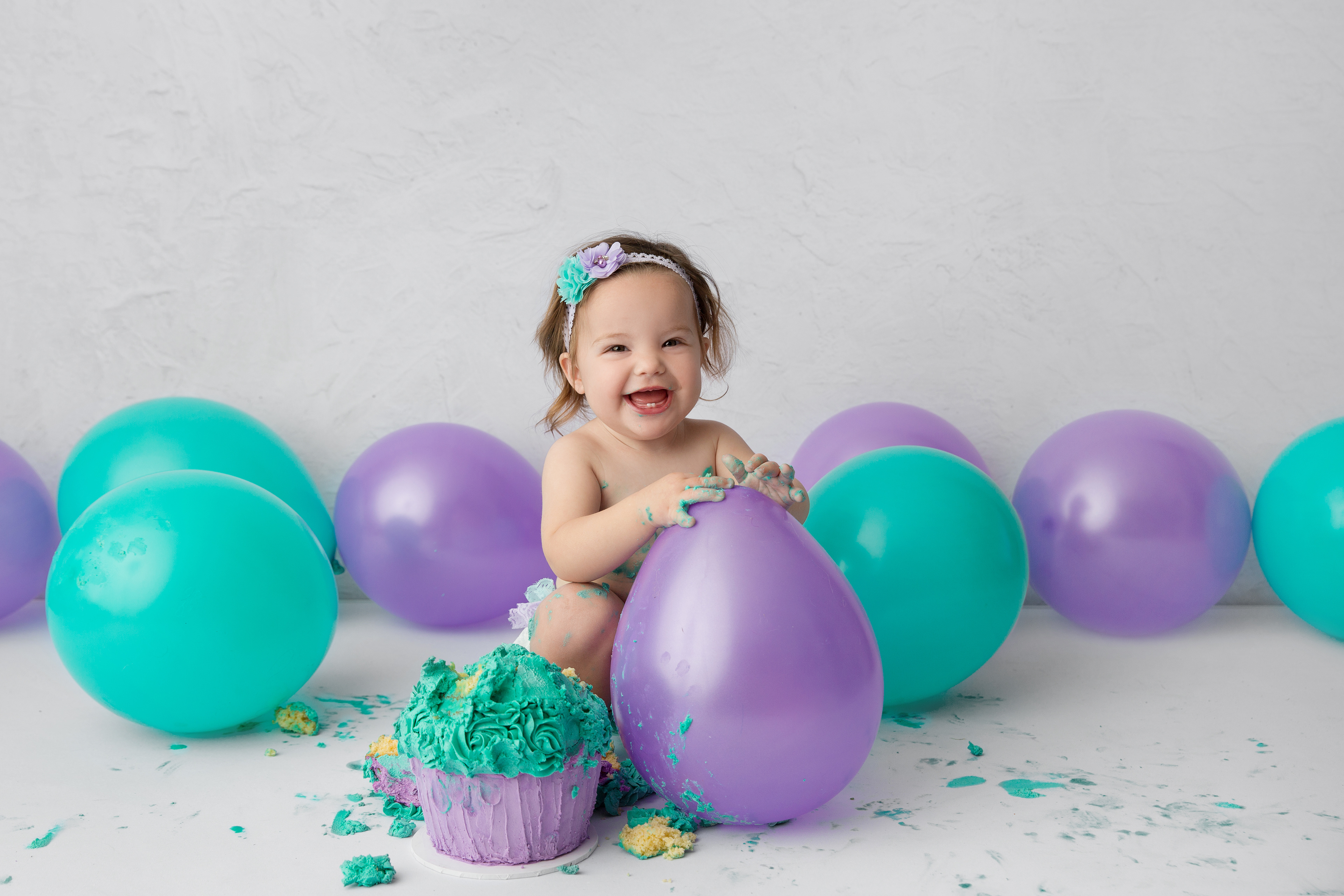 So much changes in that first year! Sitter age (6-9 months) is a perfect time for smiles and joy. 1 year Birthday milestone sessions are adorable, just more hectic as they are now crawling or walking! That is why the cake and bath are awesome distractions and so much fun. Family/sibling poses included!