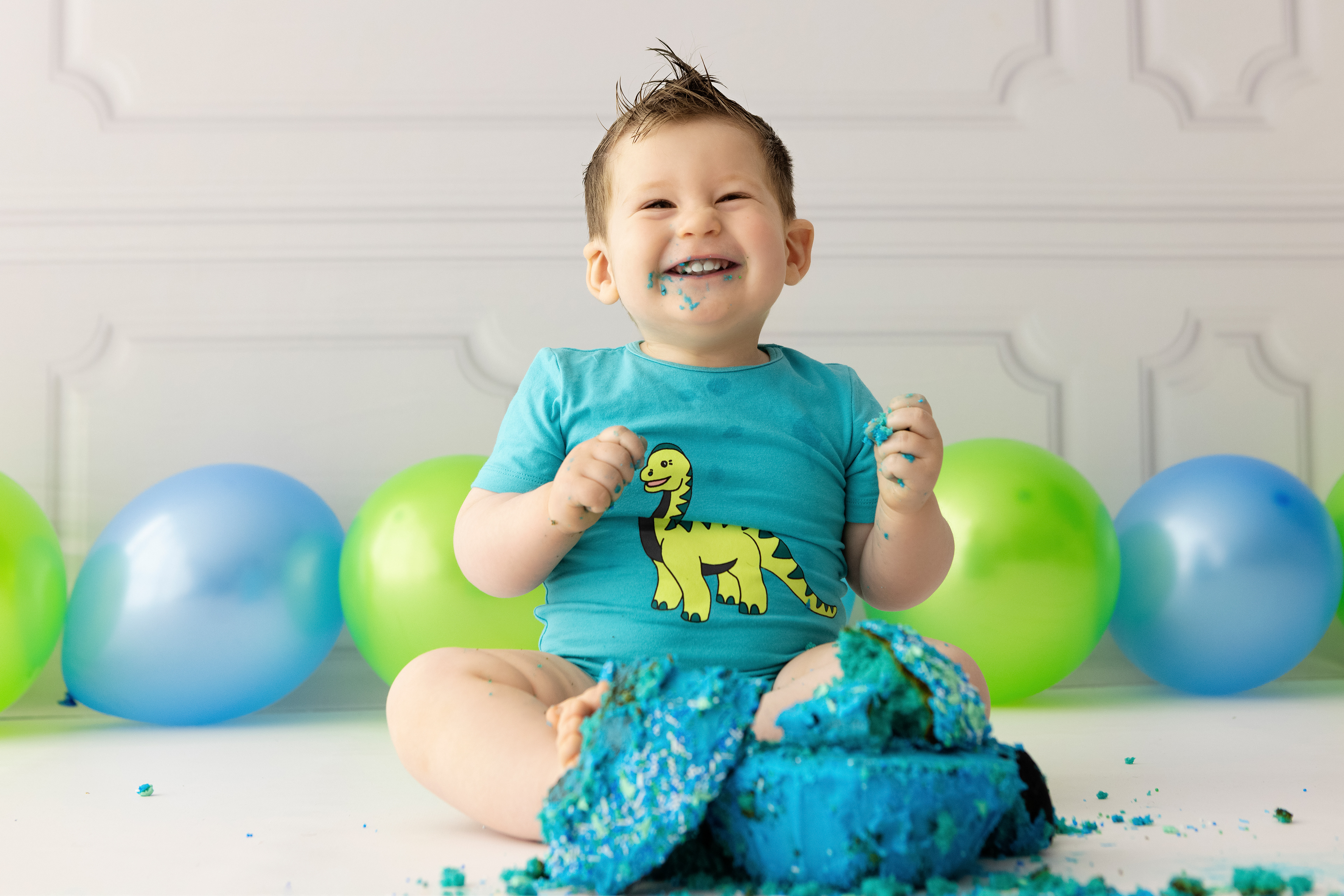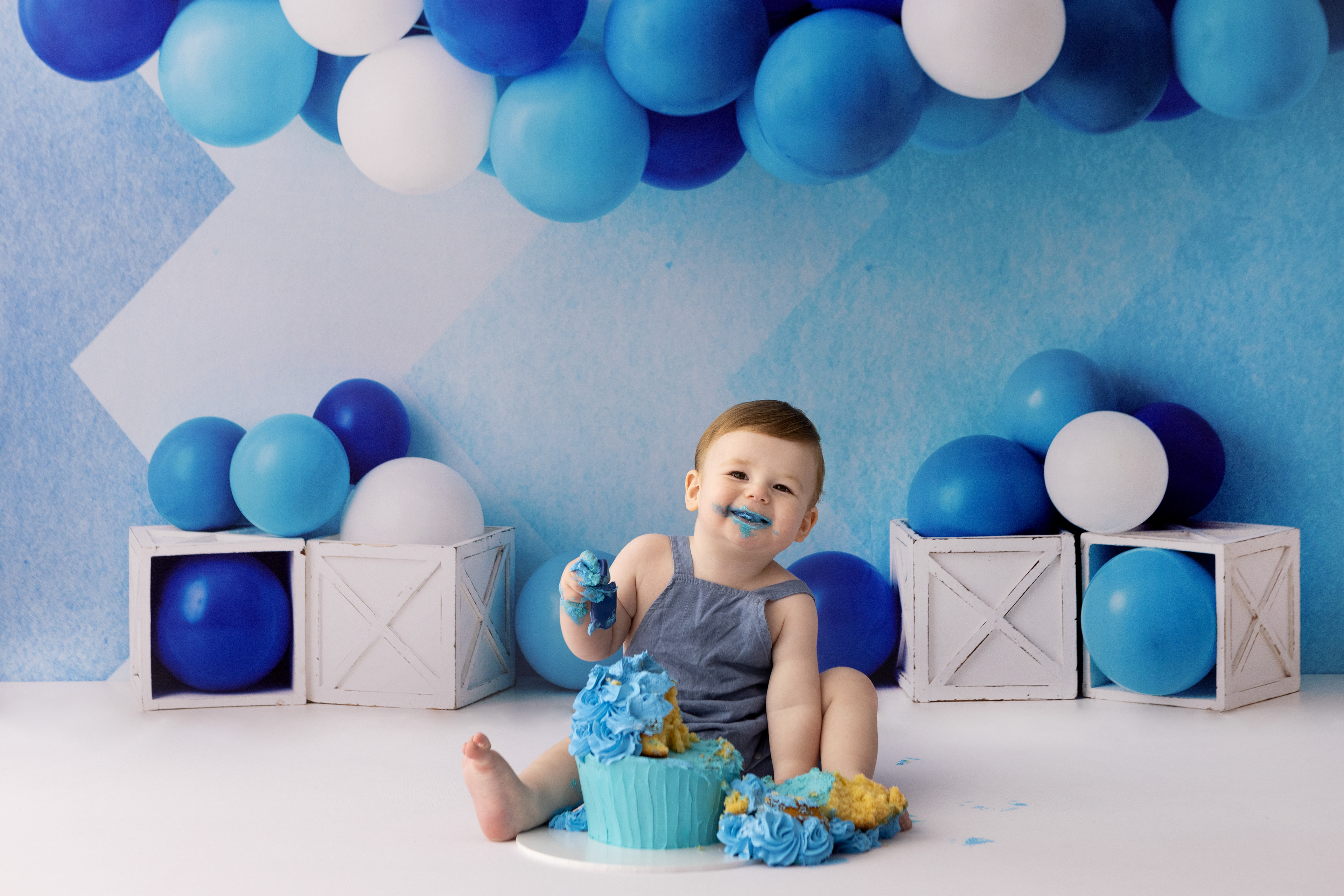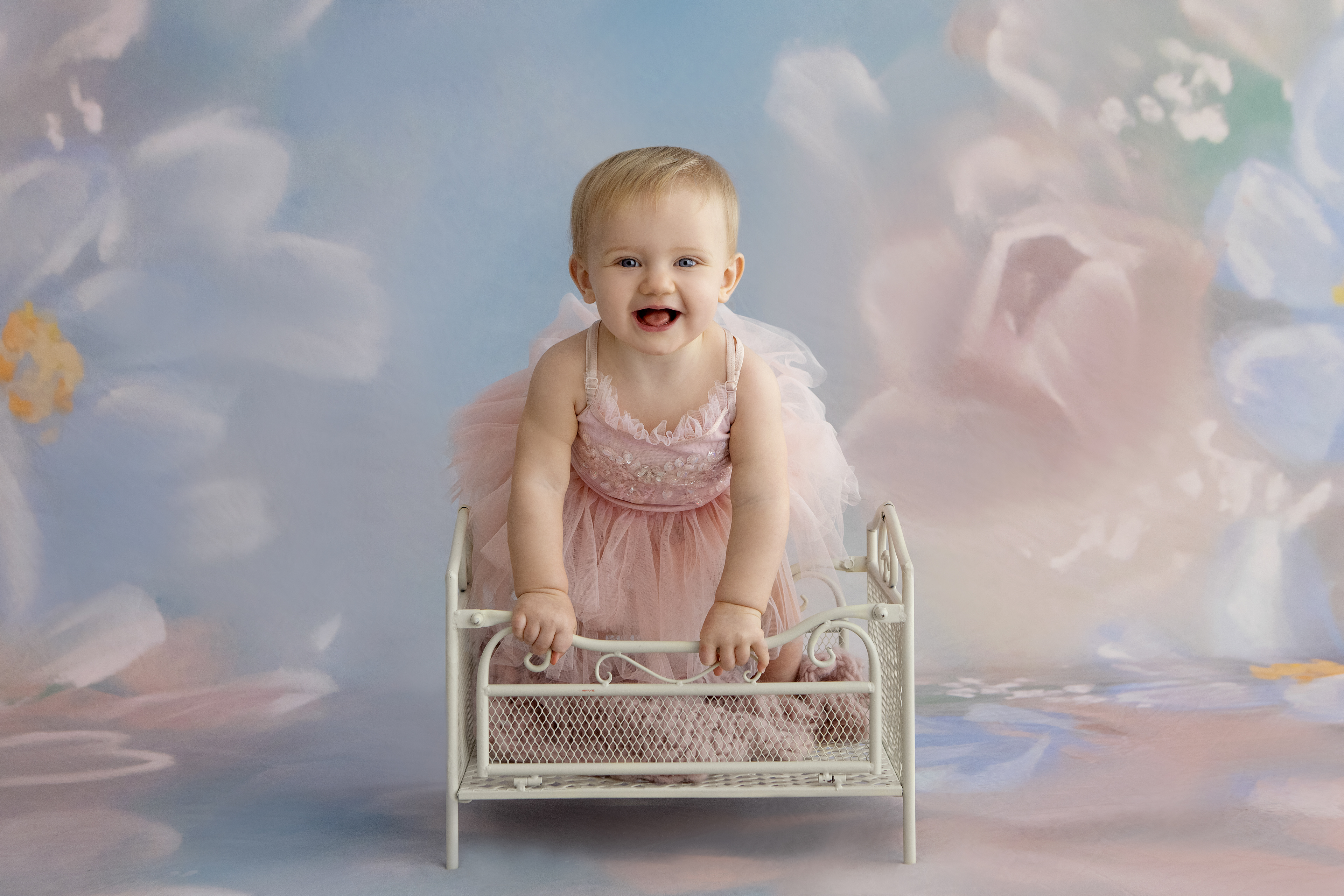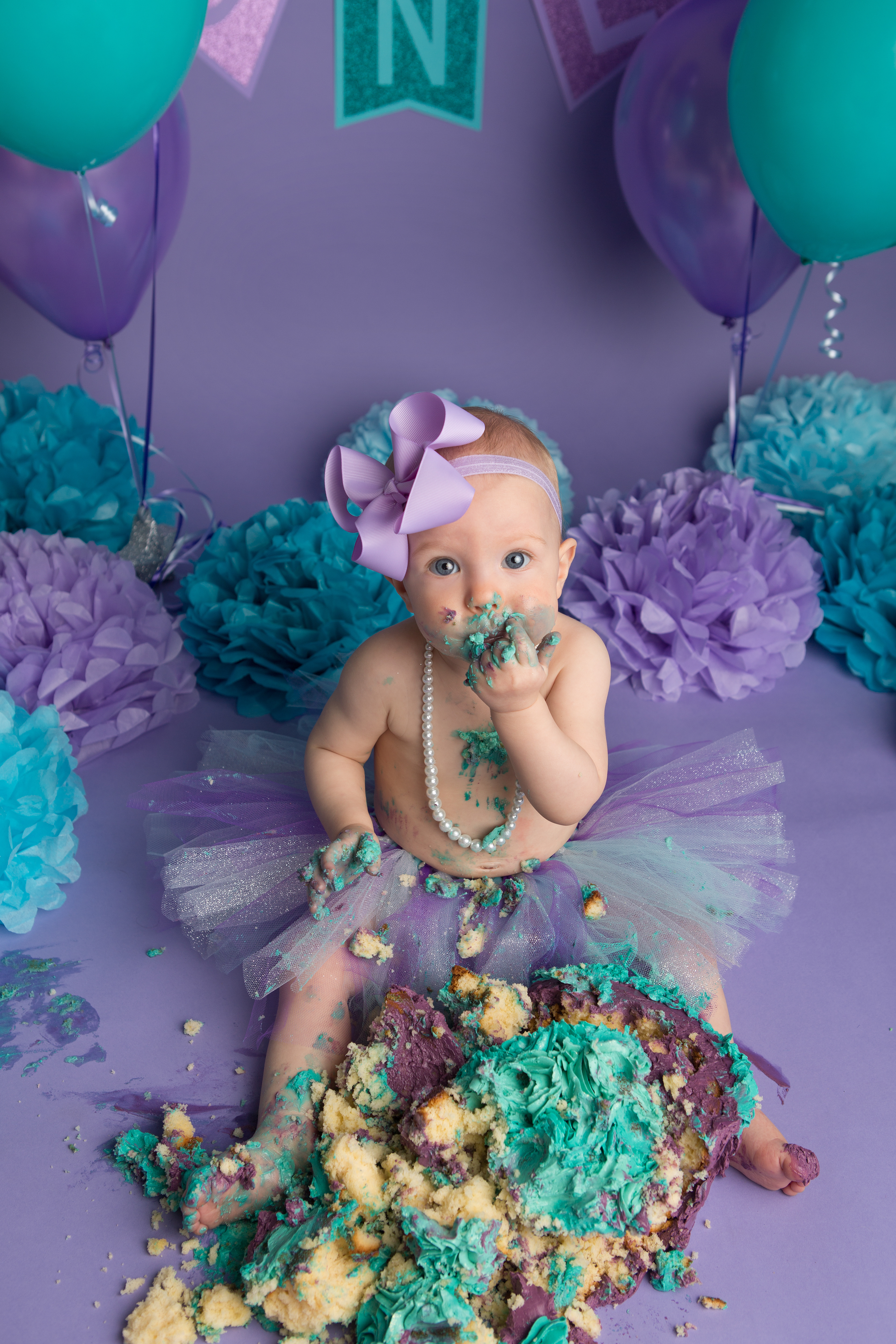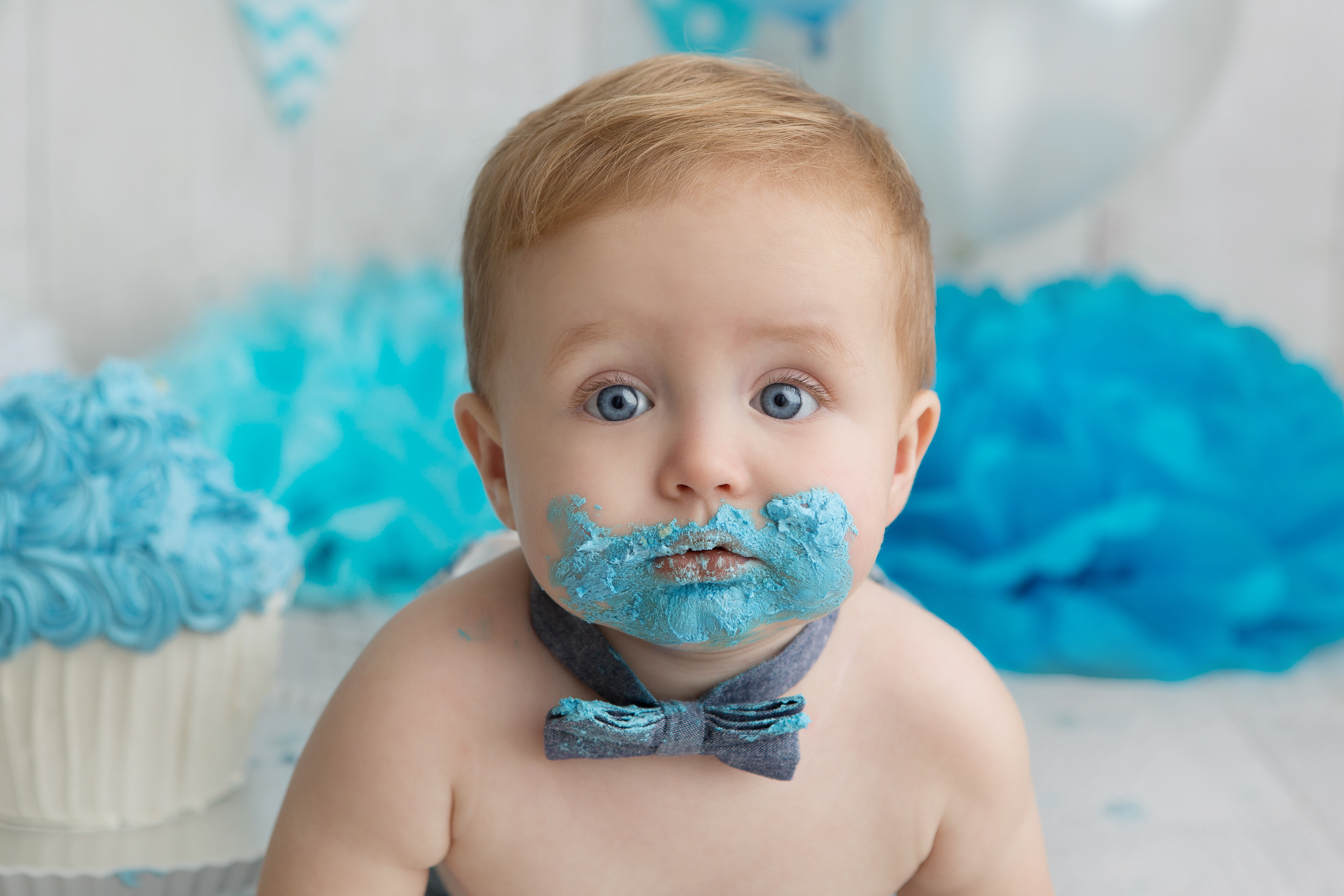 So much changes in that first year! Sitter age (6-9 months) is a perfect time for smiles and joy. 1 year Birthday milestone sessions are adorable, just more hectic as they are now crawling or walking! That is why the cake and bath are awesome distractions and so much fun. Family/sibling poses included!